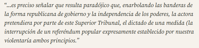 Pero como no les gustó el resultado democrático, ahora atentan contra la democracia mediante la amenaza de acciones judiciales para declarar la inconstitucionalidad de lo que votó la gente. ¿Merece nuestro sistema de justicia tener funcionarios y magistrados que tengan ese tipo de pensamientos? ¿Acaso la población no tiene derecho a elegir las normas que deben regir la vida de todos los argentinos?