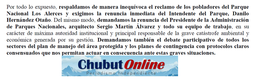 Por todo lo expuesto, respaldamos de manera inequívoca el reclamo de los pobladores del Parque Nacional Los Alerces y exigimos la renuncia inmediata del Intendente del Parque, Danilo Hernández Otaño. Del mismo modo, demandamos la renuncia del Presidente de la Administración de Parques Nacionales, arquitecto Sergio Martín Álvarez y todo su equipo de trabajo, en su carácter de máxima autoridad institucional y principal responsable de la grave catástrofe ambiental y económica generada por su gestión. Demandamos también el debate participativo de todos los sectores del plan de manejo del área protegida y los planes de contingencia con protocolos claros consensuados que nos permitan actuar en consecuencia ante estas graves situaciones.