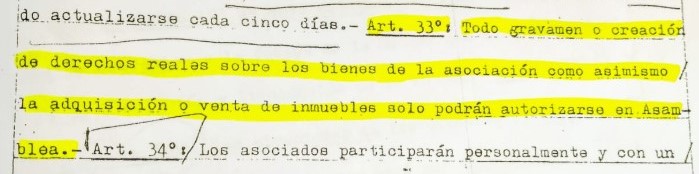 4to) Ante esta situación ya que se violaba el Estatuto en su Art. 33º) que reza: «TODO GRAVAMEN Y CREACION DE DERECHOS REALES SOBRE LOS BIENES DE LA ASOCIACION COMO ASIMISMO LA ADQUISICION O VENTA DE INMUEBLES SOLO PODRAN AUTORIZARSE EN ASAMBLEA», mientras que el sr presidente, utilizó un art., el 19) que dice que podrán resolver por sí, LOS CASOS NO