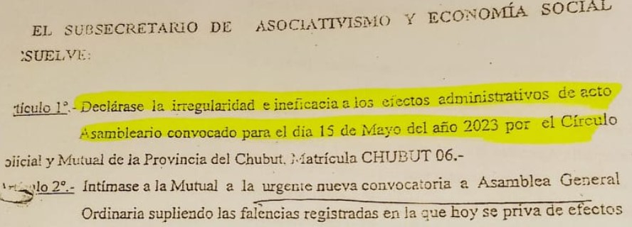 A esto, debemos agregar la irregular Asamblea convocada por LA COMISION para el día 15 de Mayo del 2023 y la cual por las irregularidades que presentaba, por mayoría se dejó sin efecto (cuarto intermedio), pero grande fue la sorpresa cuando los socios RUBEN DARIO MACEDO Y GONZALEZ GUSTAVO presentan una Nota ante el organismo de contralor, ésta expresó que IGNORABAN la realización de dicha Asamblea y que estaban en abierta violación a lo establecido en el art 19 de la Ley de Mutualidades y del artículo 30 del Estatuto Social de la propia Mutual y luego de otras consideraciones, dictaron la RESOLUCION NRO 04/2023-SSAYES declarando la irregularidad e ineficacia de la Asamblea e INTIMAN A LA MUTUAL A UNA/ NNEVA CONVOCATORIA A ASAMBLEAS GENERAL ORDINARIA SUPLIENDO LAS FALENCIAS REGISTRAS, la misma fue fechada y firmada por el Sr. Subsecretario JUAN CARLOS ARZAN el día 30/05/23.
