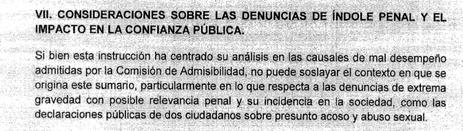 - Omisión del deber de excusación, como causal de mal desempeño. Se denunció abuso de poder y conflicto de intereses, al haber intervenido en una causa judicial sin haberse excusado, pese a mantener amistad con una de las partes, lo que configuraría una violación a los deberes de imparcialidad y ética judicial.