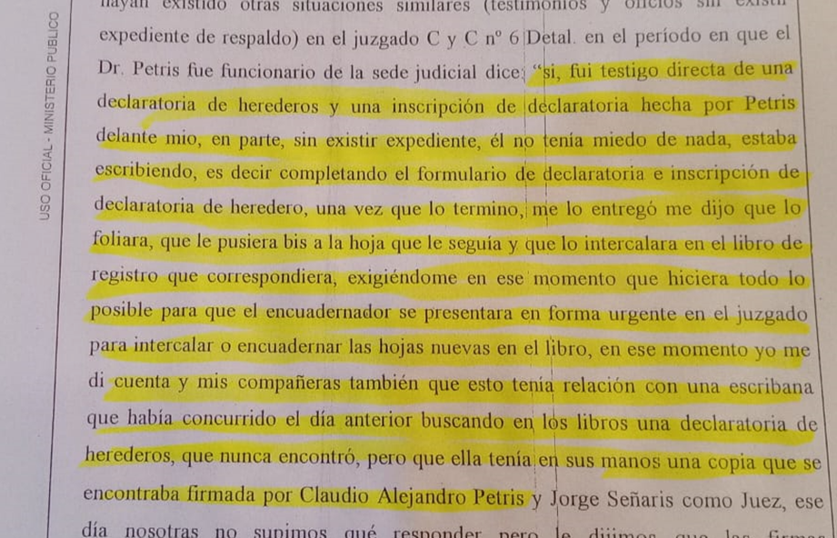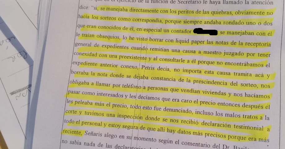 Siempre habrían existido irregularidades con Petris. Otra empleada, por ejemplo, expuso en ese sumario que “además vieron varias irregularidades como sortear a los mismos peritos, borrar con liquid paper sellos de la receptoría, etc….”.