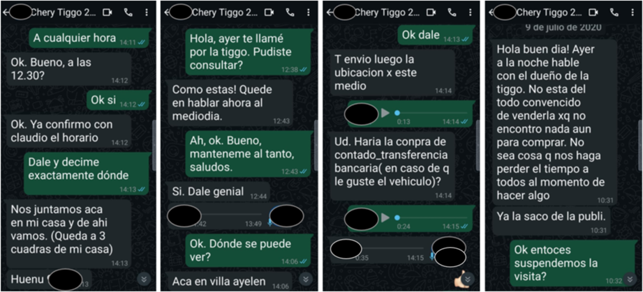 Otro caso nos llamó la atención: en 2020, cuando Petris puso a la venta un vehículo SUV Chery Tiggo modelo 2015, lo hizo a través de una persona que lo publicó en las redes sociales. Al ofrecérsele comprar el vehículo por el precio publicado (más alto que la media) y sin pedir rebaja alguna, la operación estuvo a punto de concretarse hasta que el comprador habría indicado que quería pagar mediante transferencia bancaria. Al día siguiente la persona intermediaria informó que había hablado con el dueño y que no estaba “del todo convencido de venderla xq no encontró nada aún para comprar”. Una posible excusa, según el interesado en la compra. La operación se abortó.