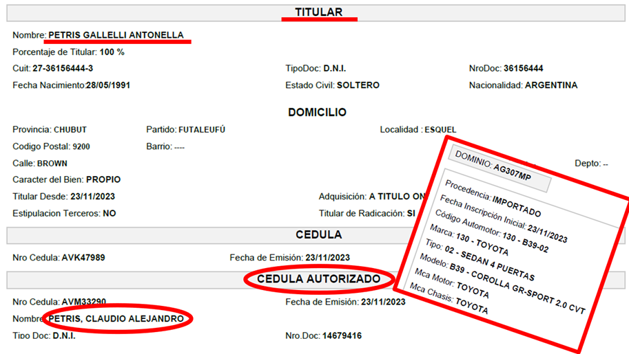 De igual forma, y conforme datos recabados en los registros públicos, Petris -tal como lo hizo con el Mini Cooper- también tendría cédulas azules en algunos vehículos de titularidad de terceros, para poder circular con los mismos. La siguiente imagen muestra que un vehículo Toyota deportivo está inscripto a nombre de su hija, pero con cédula azul se encuentra a su nombre.