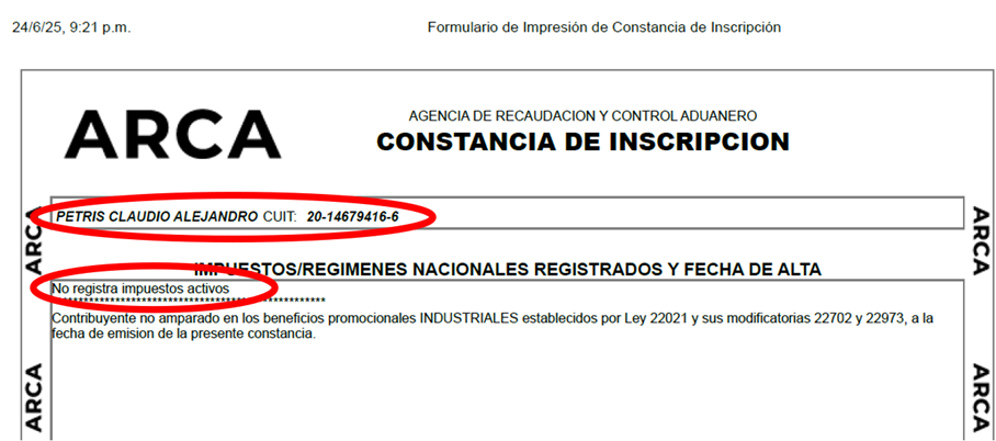 Según la Constancia de Inscripción de dicho organismo, el Dr. Petris “no registra impuestos activos”, y según averiguaciones realizadas únicamente se habría inscripto en el organismo fiscal en el período 03/02/2018 a 09/02/2019 (aunque sólo en la categoría “locaciones de servicios”, es decir, no como locador de inmuebles).