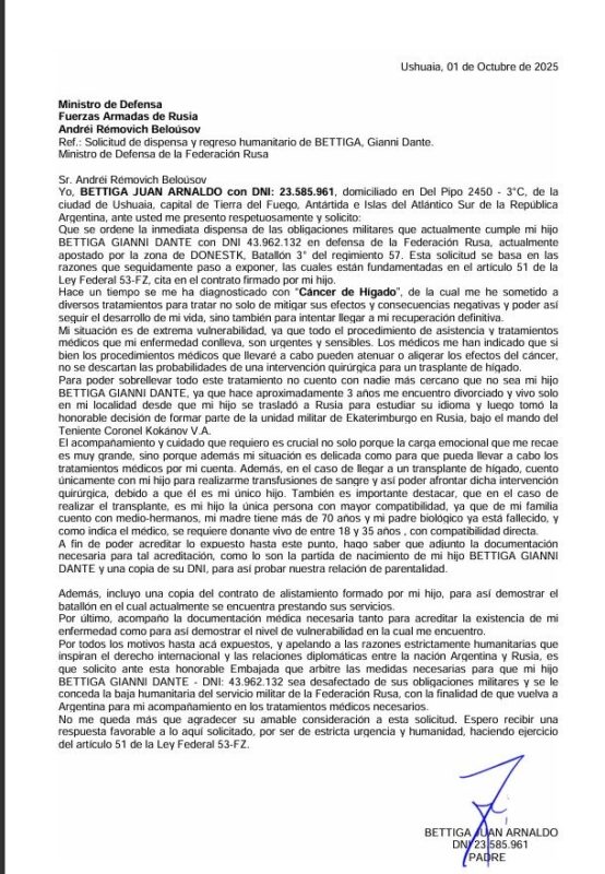 La súplica incluye además un componente profundamente humano: Juan Bettiga padece cáncer de hígado, y adjuntó su historia clínica para reforzar el pedido humanitario de repatriación. En su carta, implora que las autoridades rusas “ordenen la inmediata dispensa de las obligaciones militares que actualmente cumple mi hijo en defensa de la Federación Rusa”.