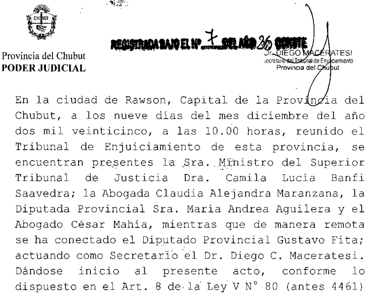 El 9 de diciembre de 2025, en Rawson, el Tribunal de Enjuiciamiento se reunió para analizar los hechos elevados por el Consejo de la Magistratura. Tras el debate, y con unanimidad entre sus integrantes, se resolvió: