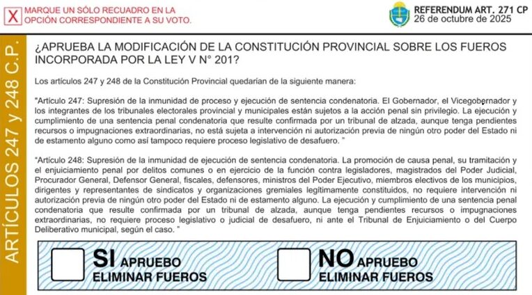 La boleta para el referéndum, simplemente tiene dos recuadros por SÍ o por NO a la quita de fueros. Ud. deberá marcar la opción que prefiera.