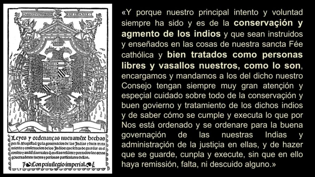 Desde los primeros años posteriores al viaje de Colón, la Corona intentó establecer normas para regular el trato hacia los indígenas. Un ejemplo temprano de ello fueron las Leyes de Burgos (1512), donde se reconocía que los nativos eran “hombres libres”, aunque bajo tutela, y se establecían medidas para su instrucción en la fe cristiana y la vida europea. Décadas más tarde, las Leyes Nuevas de 1542, impulsadas por fray Bartolomé de las Casas, prohibieron la esclavitud indígena y buscaron limitar los abusos de los encomenderos, figuras que en la práctica se habían convertido en pequeños señores feudales en ultramar.
